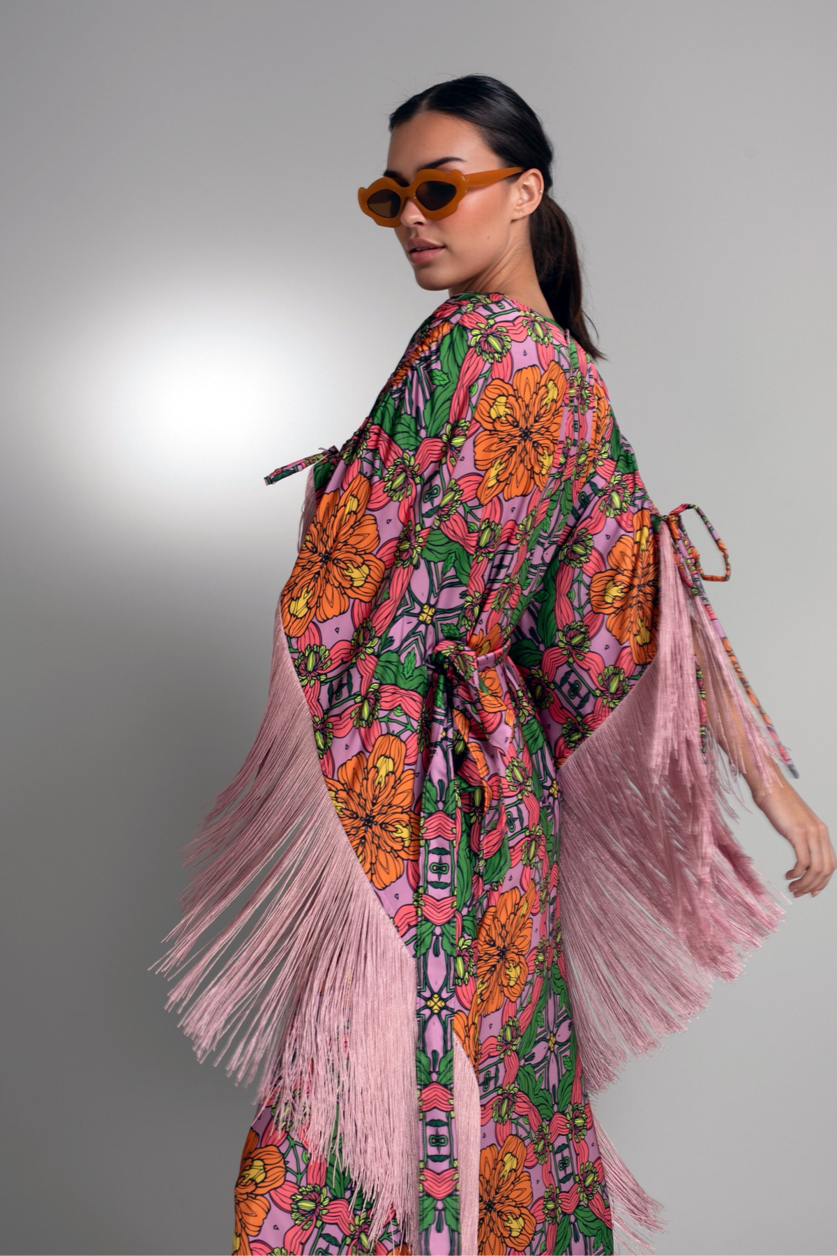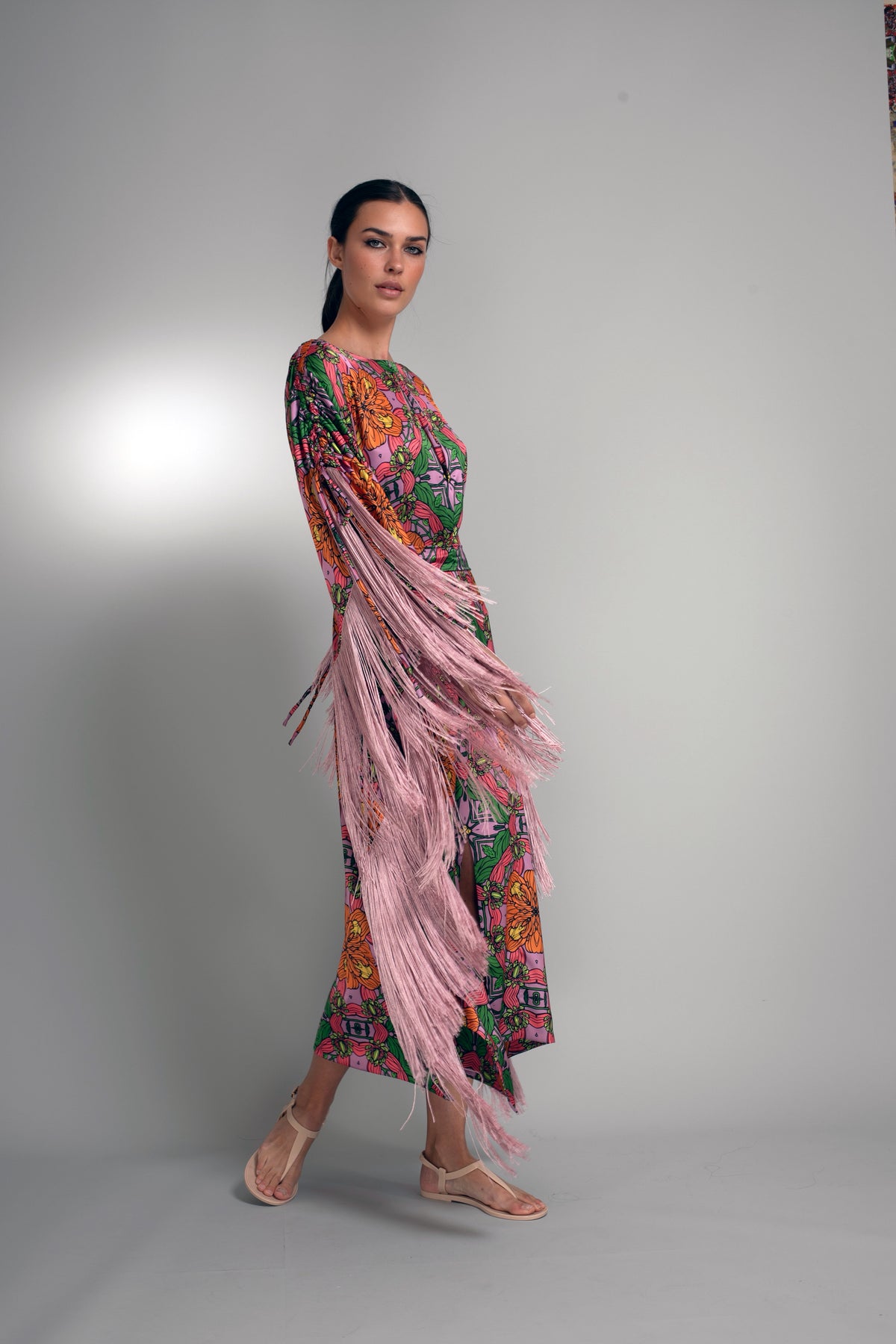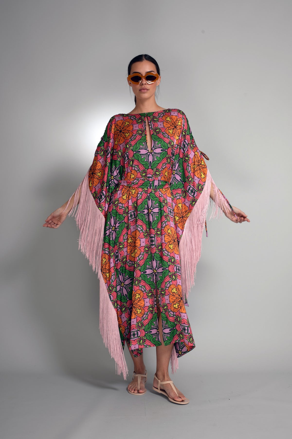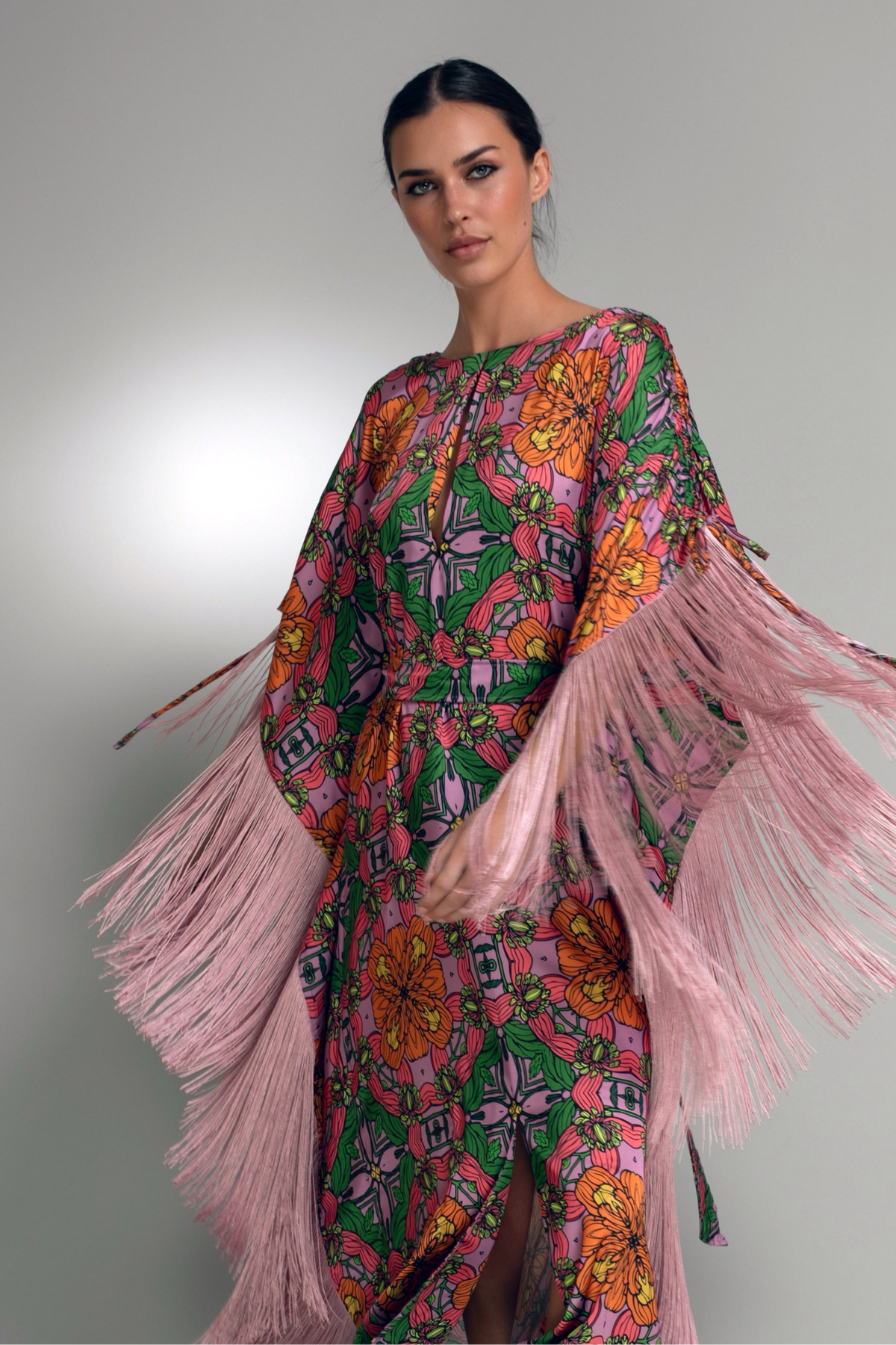 Cut in an elongated kaftan silhouette, this statement piece drapes fluidly through the body while maintaining elegant structure. A delicate front keyhole introduces subtle allure, balancing the drama of cascading blush fringe that traces the sleeves and sides. With every step, the fringe animates the print, creating dynamic motion against the smooth sheen of duchess satin.