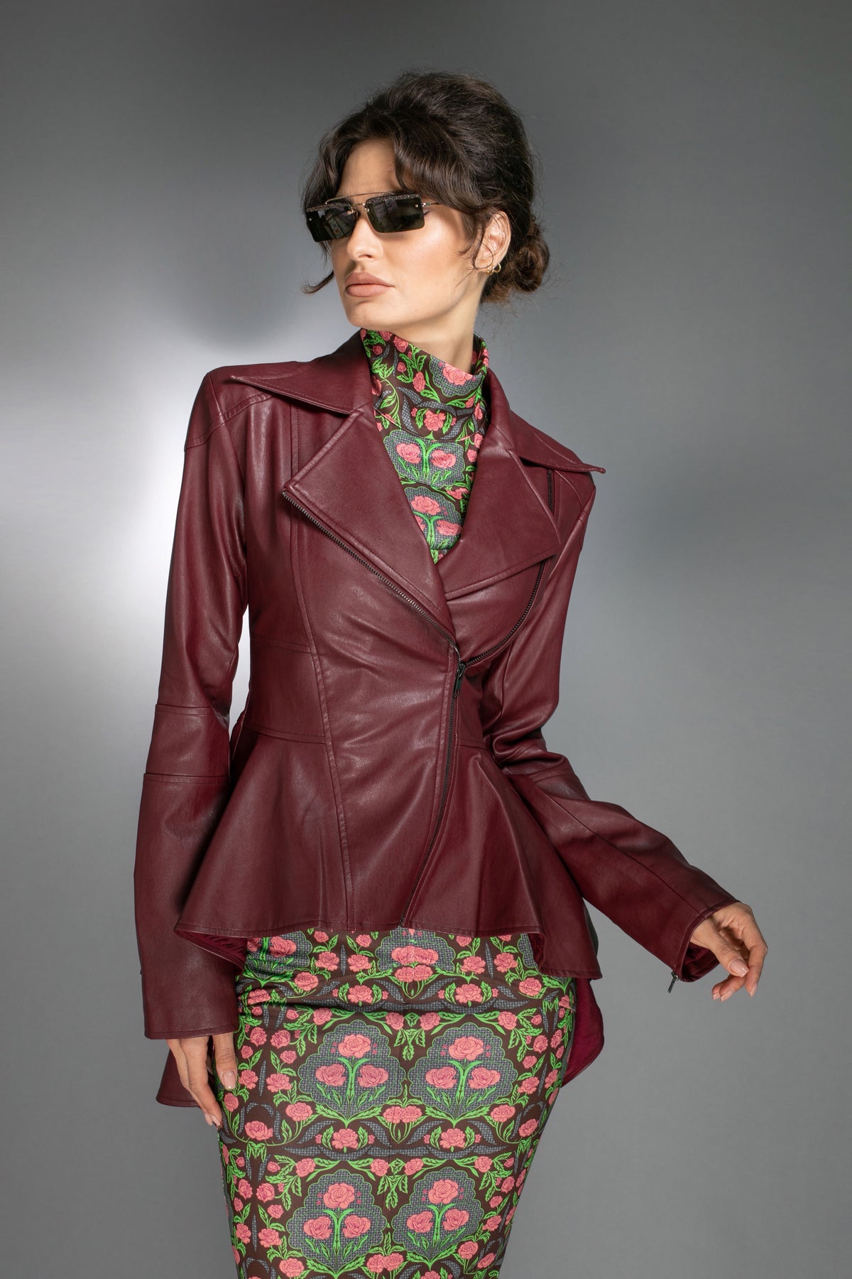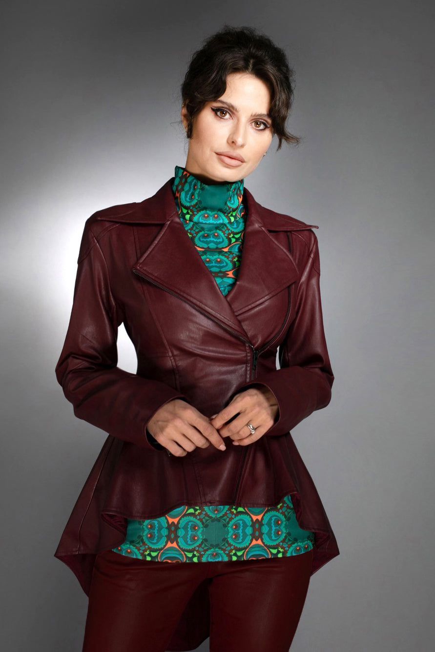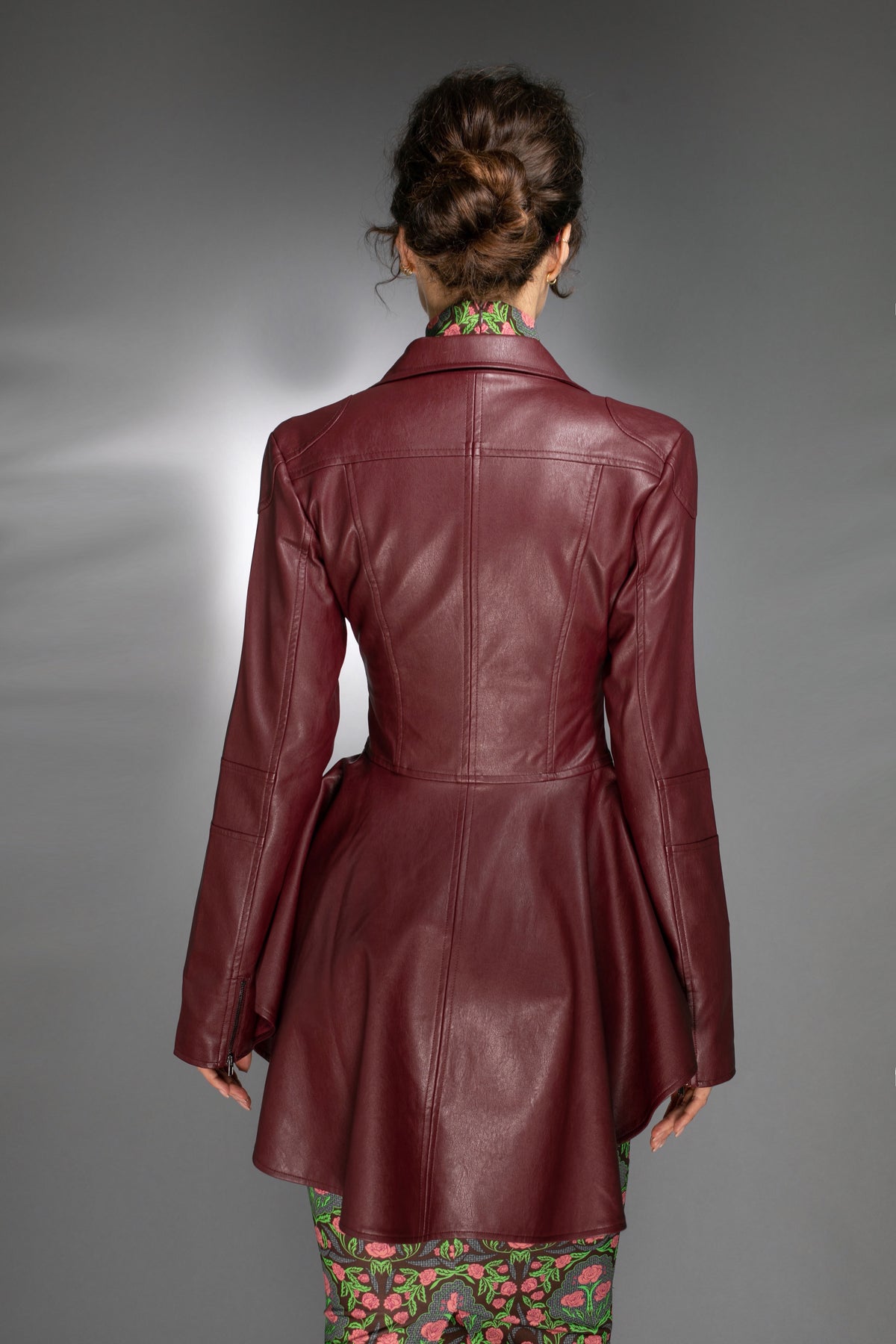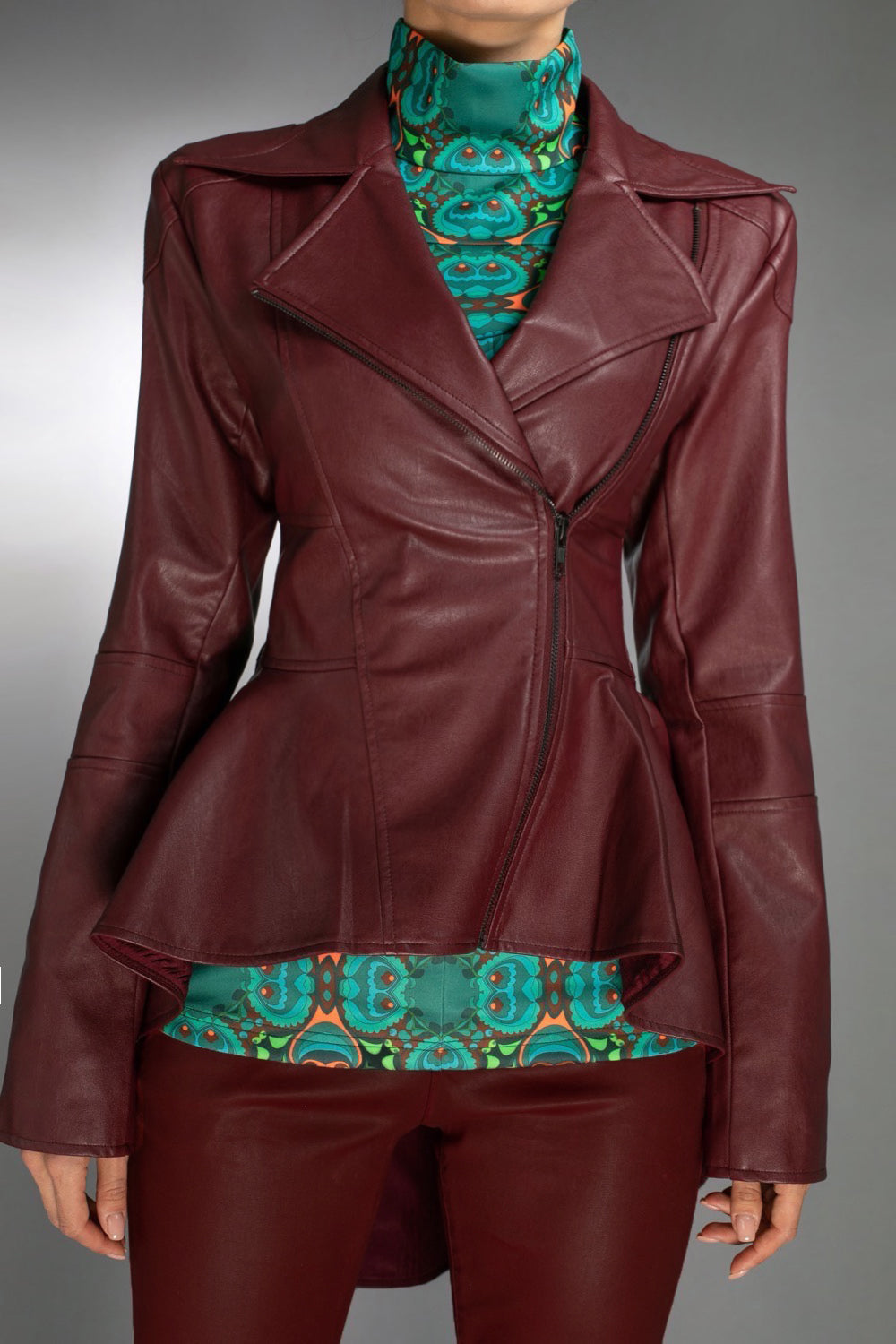Crafted from supple Italian leather, this exquisite jacket is the ultimate statement in sophisticated contrast. Its architectural design features a sharp, wide spread collar and an edgy diagonal front zipper, all grounded by a dramatically sculpted peplum waist that cascades into a feminine frock detail at the back. Rendered in a delicate blush hue, this Hi-Low jacket infuses any cool-weather look with unparalleled structure and rebellious flair.