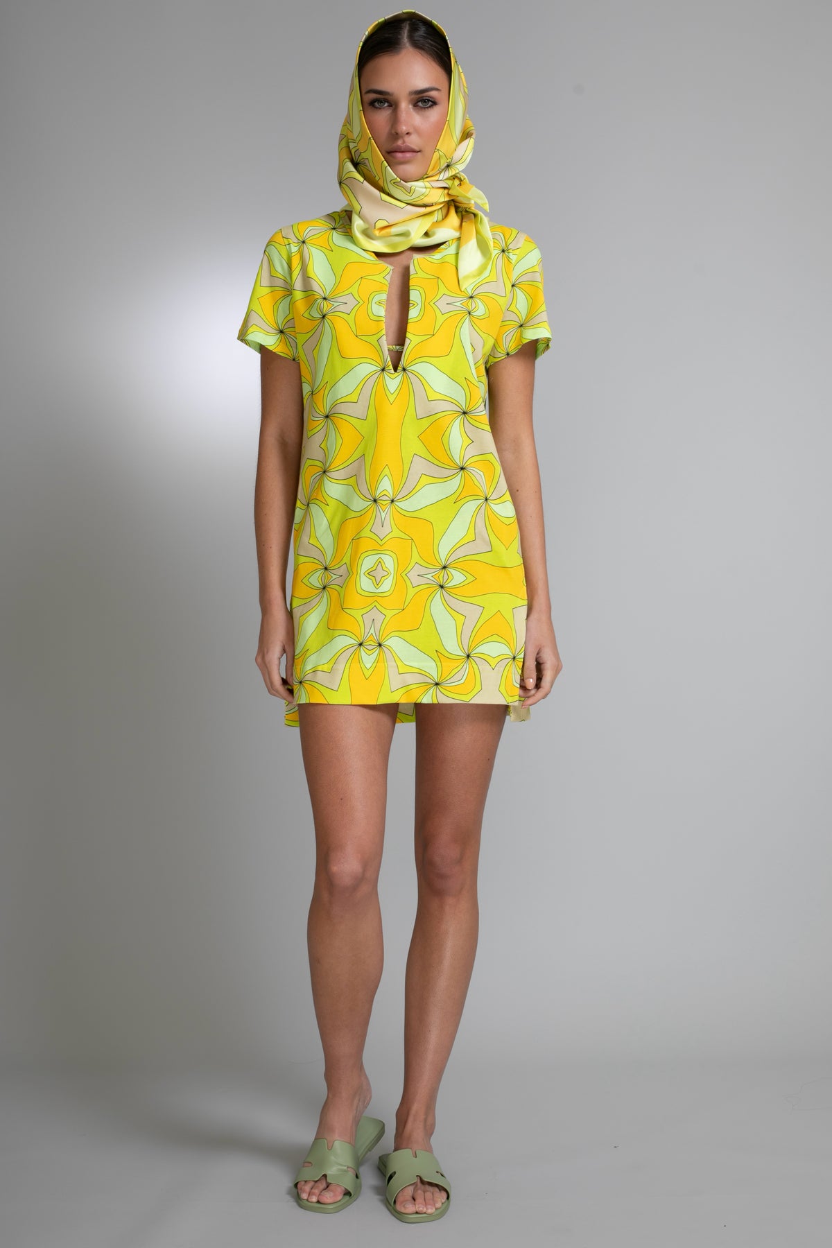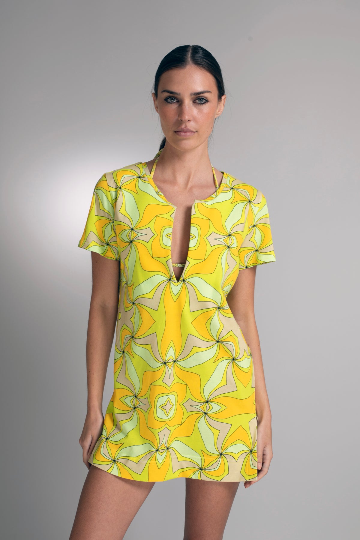 Fresh, effortless, and art driven. The Citrine Bloom T-Shirt Dress Mini Dress showcases Nuvula’s lush fluid citron and muted sage petals radiate from a central star in this sophisticated, sun-drenched geometric print. The relaxed shift silhouette allows the print to take center stage while offering comfort and ease for warm weather dressing.