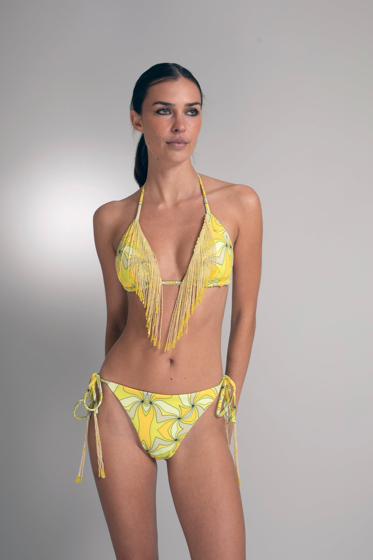 Woman wearing a yellow floral bikini against a gray background