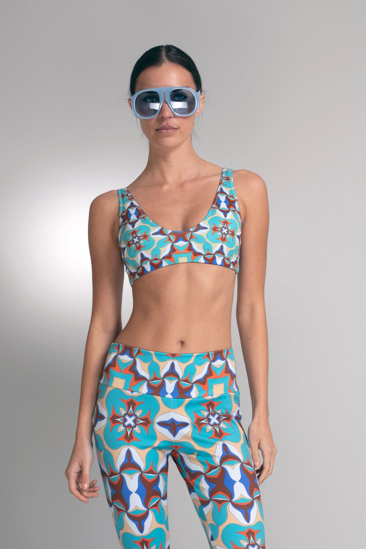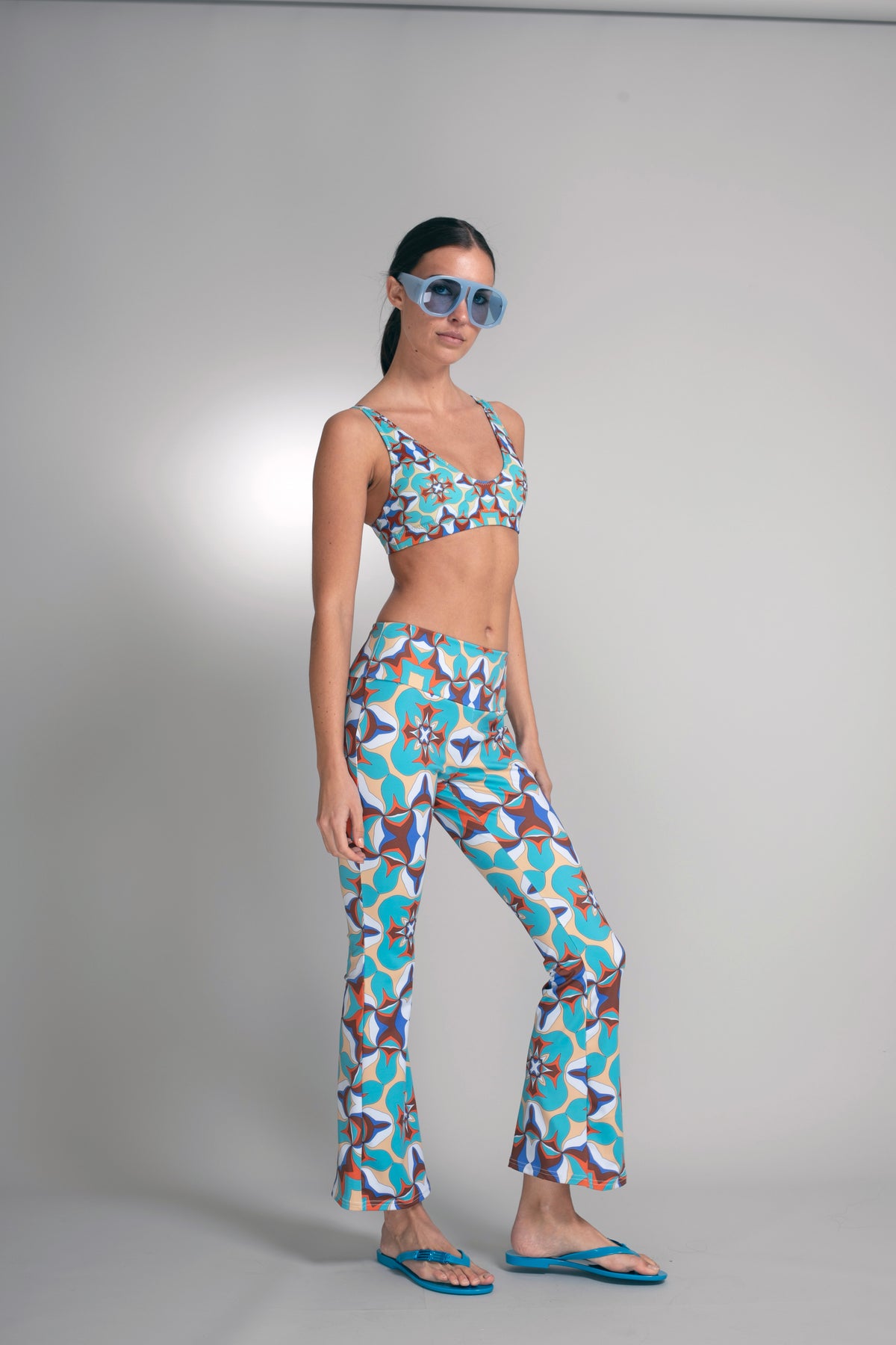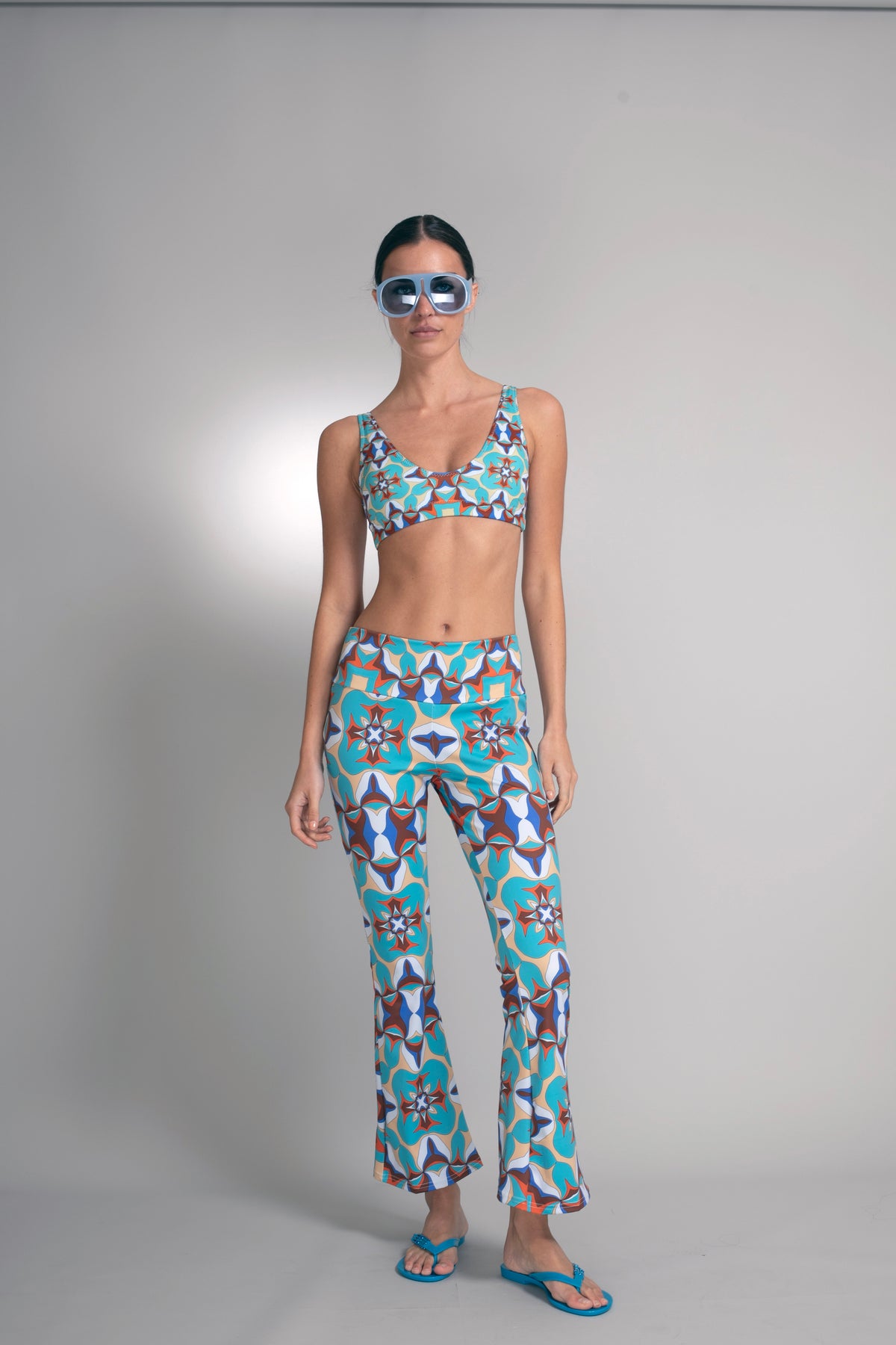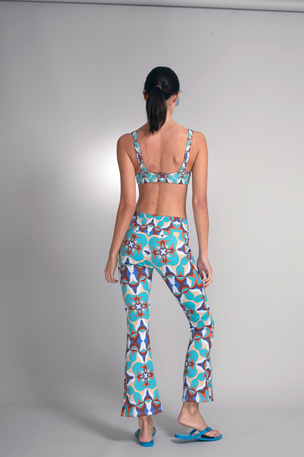 The Kaleido Crop Flare Pants showcase Nuvula’s vibrant geometric star motif in layered turquoise, rust, ivory, and deep blue. The composition feels rhythmic and architectural, where saturated color and precise symmetry create a bold yet refined visual story.